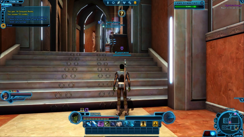 Vella-karnn, One of the two friendly people and certainly one of God’s children, proceeded to lead me through the planet we were both on with his character guiding me through missions, and typing in the chat area how to complete it for over an hour. If you ever encounter Vella-karnn in any game, you should make it your life’s work to help him complete his missions.